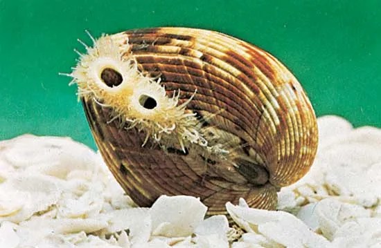 Inside the shell is the soft body of the cockle. This includes a mantle, a layer of tissue that lines the shell, with three openings: one for taking in water, one for pushing water out, and one for extending a muscular foot. This foot is used to dig into the sand, helping the cockle stay safe from predators. It also allows the cockle to “jump” by quickly bending and straightening, which can help it escape danger.