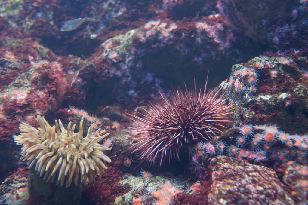 Typically found on rocky ocean floors, sea urchins are spherical or oval in shape, with a rigid, calcified shell called a “test,” which is composed of interlocking plates of calcium carbonate. These tests come in a range of colours including black, green, purple, and red, and can vary in size from 3 to 10 cm, although some species can grow as large as 36 cm. The body of the sea urchin is symmetrical, and this symmetry is most apparent when looking at the test from above or below, as it has five distinct sections radiating out from a central axis.